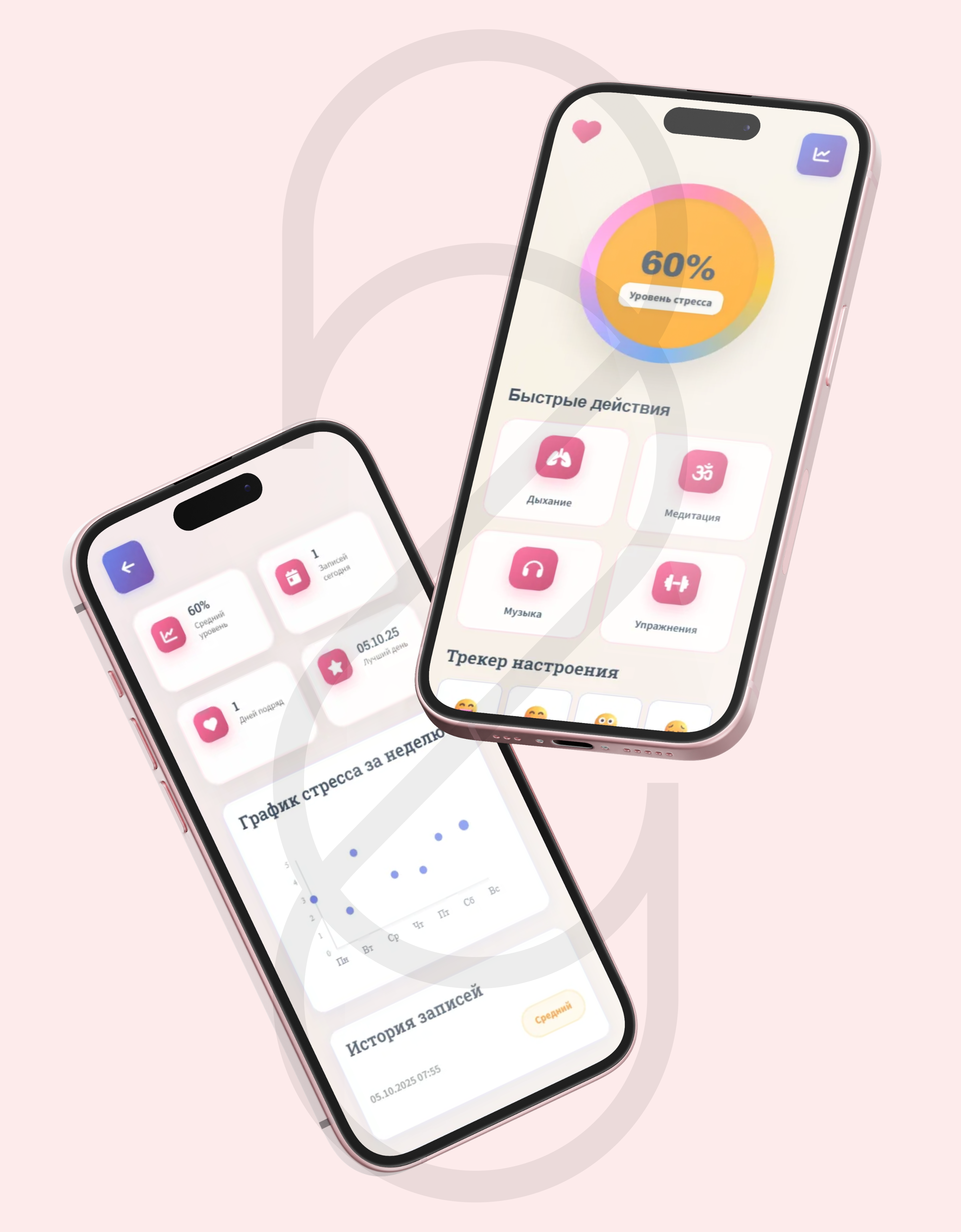 Простой и интуитивный интерфейс с красивым дизайном, адаптированный для мобильных устройств. Помогает выявлять закономерности в эмоциональном состоянии и формировать здоровые привычки. Цель — помочь пользователям лучше понимать свои эмоции и эффективно справляться со стрессом в повседневной жизни.